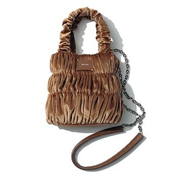 ショルダーとしても使える2WAY。光の反射で濃淡が変わるベロアの素材とシャーリングを施したエレガントなデザイン。 ブラウンベロアバッグ/ヴュレ(キューズ)