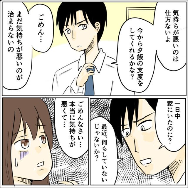 「気持ち悪いのは仕方ないよ。今から夕飯の支度をしてくれるかな?」と言われ、「ごめん・・・まだ気持ち悪いのが治まらないの。」となんとか伝えたのですが「一日中家にいたのに?最近、何もしていないじゃないか?」と言われたのが、家でダラダラしていたとでも言うように聞こえて「ごめんなさい・・・本当に気持ちが悪くて。」もうそれしか言えませんでした。