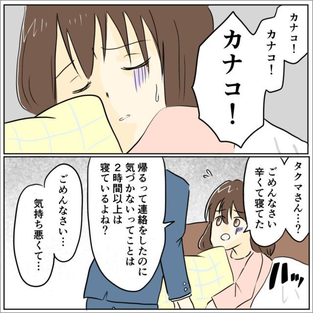 ハッとして起き上がり「ごめんなさい辛くて寝てた」と言う私に夫は「帰るって連絡をしたのに気づかないってことは2時間以上は寝ているよね」と言いました。