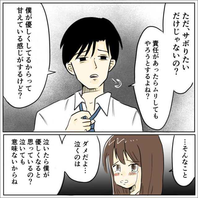 夫はそんな私に呆れたような顔で「ただ、サボりたいだけじゃないの?責任があったらムリしてもやろうとするよね?僕が優しくしているからって甘えている感じがするけど?」と言いました。ショックで涙がこぼれました。それでも夫は更に「ダメだよ泣くのは。泣いたら僕が優しくなると思っているの?泣いても意味ないからね」と言ったのです。