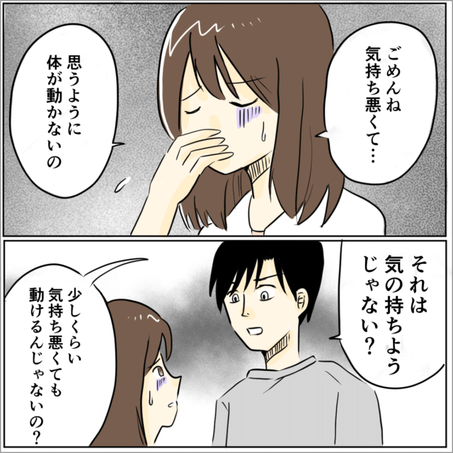 「ごめんね気持ち悪くて・・・思うように体が動かないの。」夫のサポートをしたい気持ちはもちろんありますが、つい弱音を吐いてしまうと、夫は「それは気の持ち様じゃない?」と真面目な顔で言いました。「少しくらい気持ち悪くても動けるんじゃないの?」と。
