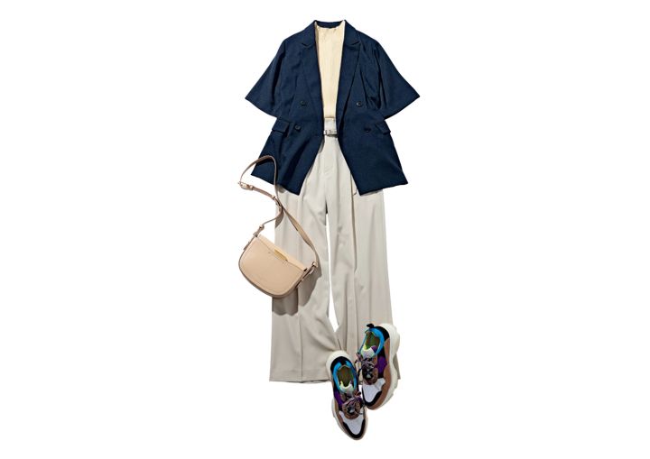シアーニットセット(ノースリニット)¥23,100/ルーニィ ベルト付きパンツ¥12,100/グリーンレーベル リラクシング(ユナイテッドアローズ グリーンレーベル リラクシング ルミネ有楽町店) ジャケット¥18,920/インディヴィ(ワールド) ショルダーバッグ¥64,900/ジャンニ キアリーニ(ジャンニ キアリーニ 銀座店) マルチカラースニーカー¥19,800/MANA