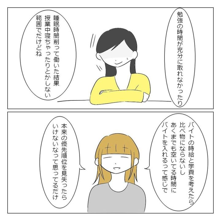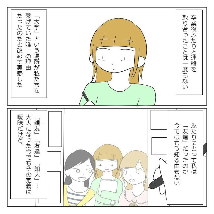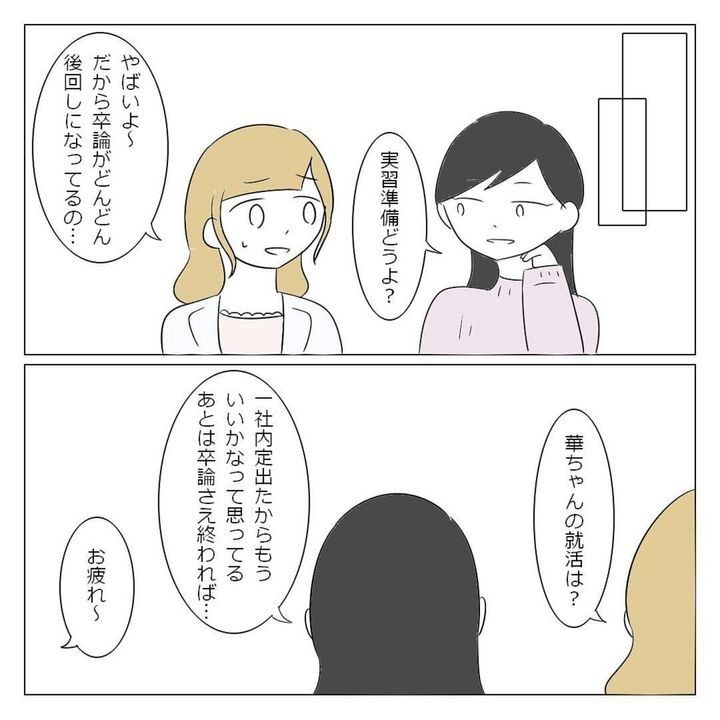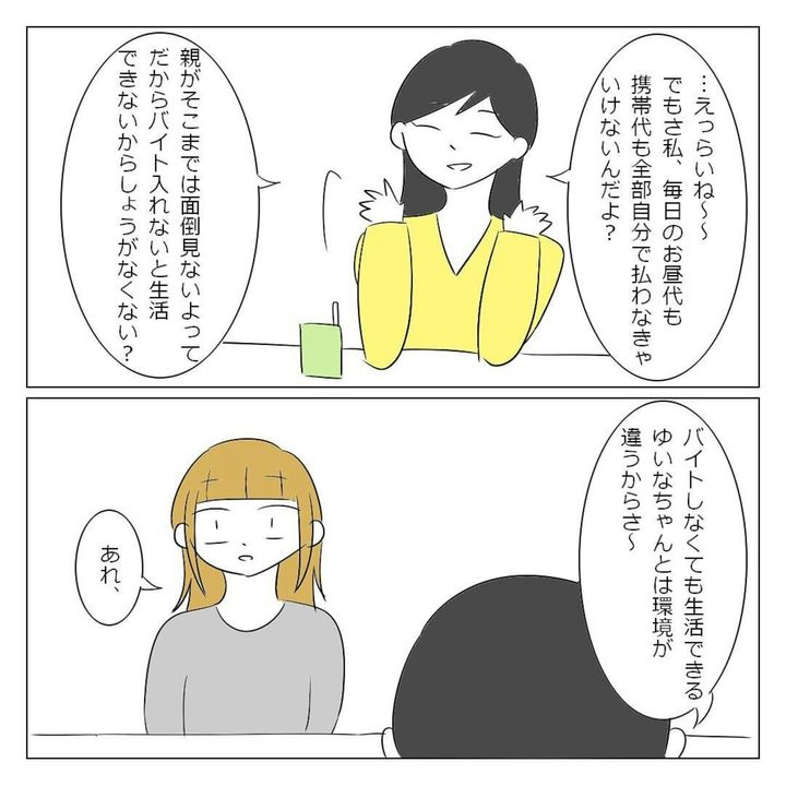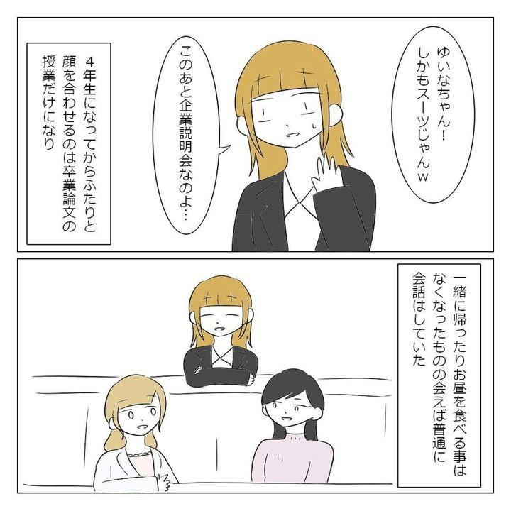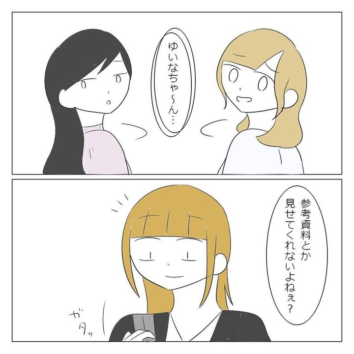 大学生になったばかりのゆいなさんは、学部内で1人でいることに危機感を覚えていました。そんなとき、オリエンテーションで高校の同級生・美姫と華に再会。ひとりぼっちを回避できたことに安堵(あんど)します。一緒に過ごす時間は楽しかったものの、徐々に2人はゆいなさんにノートを借りて授業をサボったり、急にランチをすっぽかしたりするように。ゆいなさんはモヤモヤを募らせていきました。