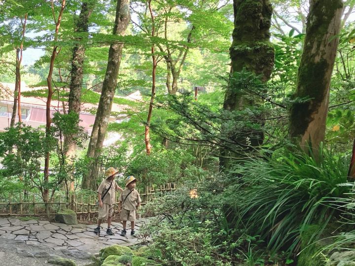 子どもたちはというと、夜は存分に温泉を満喫していましたが「朝から温泉はいいや~」とのことで、旅館敷地内の散策から2日目をスタート。東京のうだるような暑さとは裏腹、朝は気持ちよく快適。