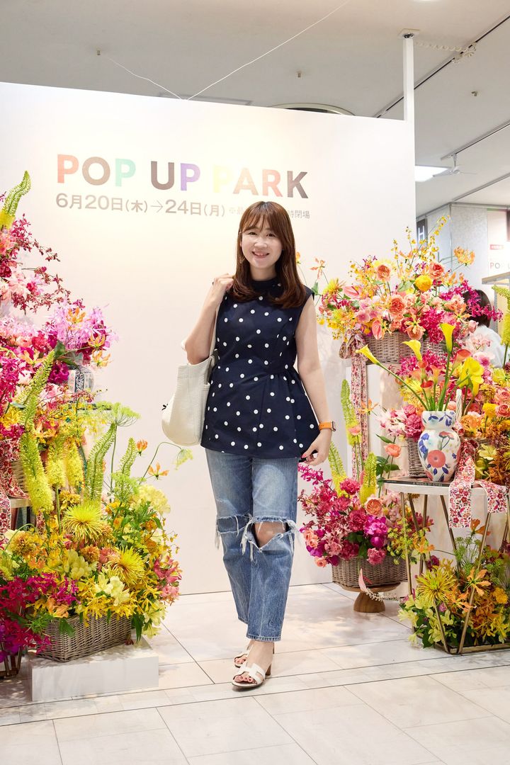 「3人の子育て中はバタバタでワンツーコーデが多いので、ネイルはいつも華やかなデザインにしてポイントにしています。指先なら濃い色でもコーデに響きにくく、今回はこのポップアップに合わせて期間限定で思いきり夏カラーに。楽しめるのが約一カ月と短期間だからこそ、春はパステル、秋はアースカラー、冬はクリスマスカラーなど…そのシーズンならではの楽しみ方ができるのがネイルの魅力だと思います」日比祐歌さん・36歳(165cm/11歳と5歳の女の子と3歳の男の子ママ)