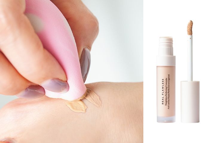 ファンデと1:1の割合で出して使うことで肌に馴染みます。手の甲に出して、水スポンジの先で混ぜて隠したいところにのせて。使用アイテム:汗、水、皮脂に強い。リアル フローレス ウェイトレス パーフェクティング コンシーラー 1N1¥4,730(ローラ メルシエ ジャパン)