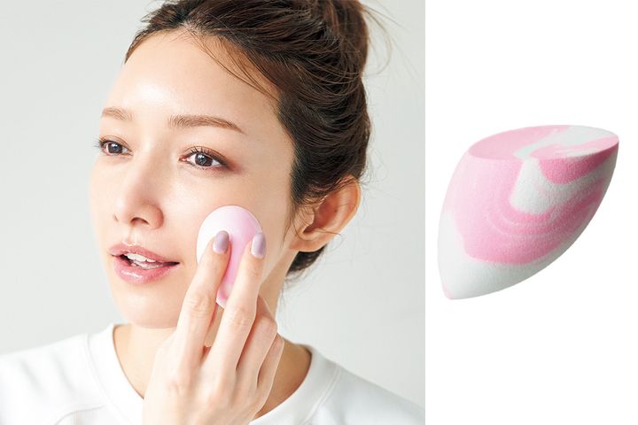 ②ウォータリー系のクリームをのせたら、水を含ませたスポンジで肌全体をタッピングします。余分な皮脂をとって崩れにくく。使用アイテム:赤ちゃんのほっぺみたいなふわふわタッチ。そのままでも使えますが、今回は水を含ませて使用。ビー アイドル ベビパフ¥990(かならぼ)