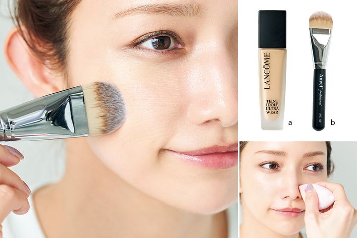 手の甲に2プッシュ出し(半顔1プッシュ)ブラシにつけて顔にのせたら、先ほどの水スポンジでたたき伸ばします。半顔ずつ仕上げるのが大切。額や鼻はブラシに残ったものを。小鼻は毛穴を埋めるようにいろんな方向から押し込むのが崩れにくくするポイント。使用アイテム:a 肌と一体化する自然なマット。タンイドル ウルトラ ウェア リキッド N BO-01 SP F48・PA++ 30ml ¥7,590(ランコム) b テクいらずで肌のアラを簡単にカバー。時短リキッド&クリームファンデーションブラシ ANC 139¥1,620(ANCCI brush)