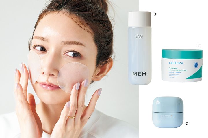 ①肌を冷やすことが毛穴レスメイクでは大切。化粧水のあとは三角ゾーンにシートパックをして、みずみずしいクリームで蓋を。使用アイテム:a 肌の内側にアプローチするエイジングケア成分がたっぷり入っています。エッセンスローション 150ml ¥6,380(MEM)b 液だれしにくい部分用シートマスク。エイシカ365 クイックマスクパッド 60枚入り¥2,860(AESTURA)c 瞬時に肌が潤い、保湿力が長時間持続。ウォーターバンク クリーム〈乾燥肌用〉50ml ¥4,400(ラネージュ)