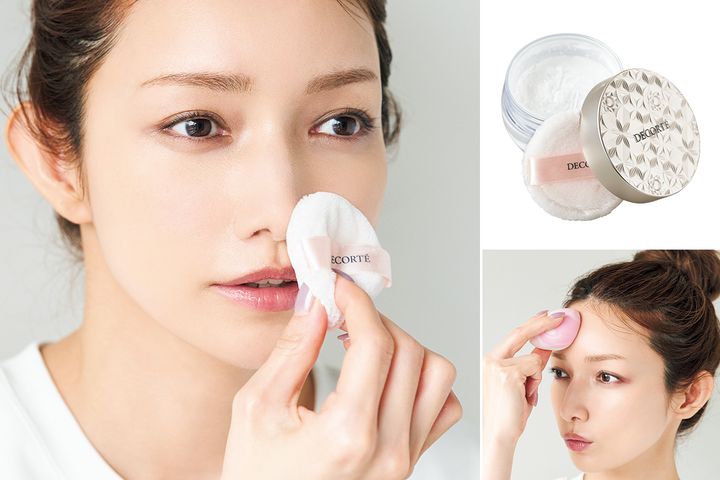 ファンデやコンシーラーをのせた後はもちろん、お粉を顔全体にパフでのせた後も水スポンジで全体をタッピングして皮脂をとること。使用アイテム:透明感が高まるシアーなマット。品のいい澄んだ肌が叶います。ルース パウダー 07 20g ¥6,050〈パフ付き〉(コスメデコルテ)