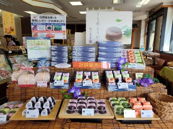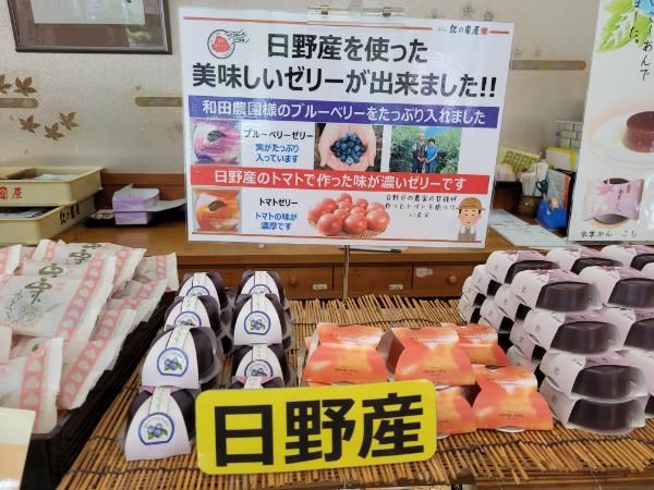 「紀の國屋」さんは地域振興にも力を入れていらっしゃり、日野の食材を使ったお菓子を作られたり、日野の農家さんのお野菜を店内で販売されたりもしています。伺った際には、日野産のブルーベリーとトマトを使ったゼリーが販売されていました。果実の味がしっかりと感じられる濃厚なゼリーです。