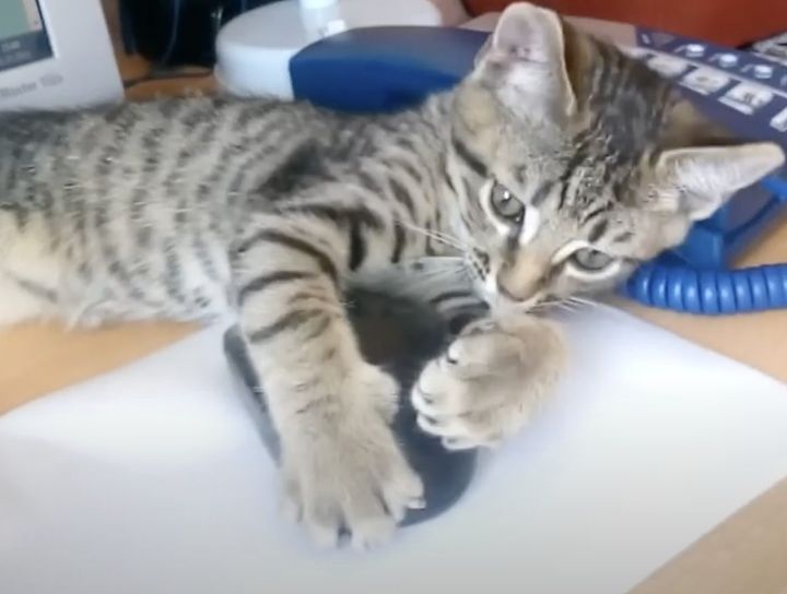 3. 触らにゃいで! マウスを気に入って抱きしめる子猫。