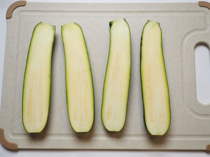 1. ズッキーニの両端を少し切り落とし、縦半分に切る。