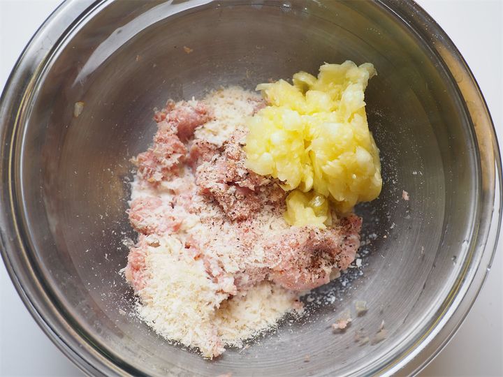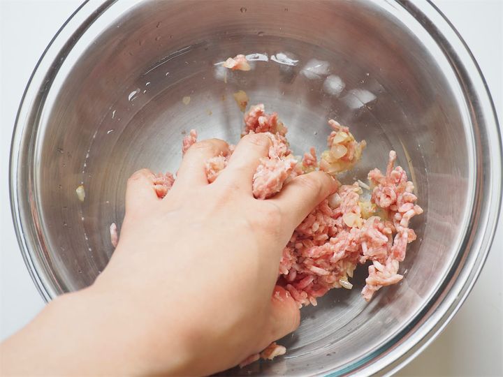 6. 氷水を入れたボウルに別のボウルを重ね、その中に5、豚ひき肉を入れこねながら混ぜ合わせる。