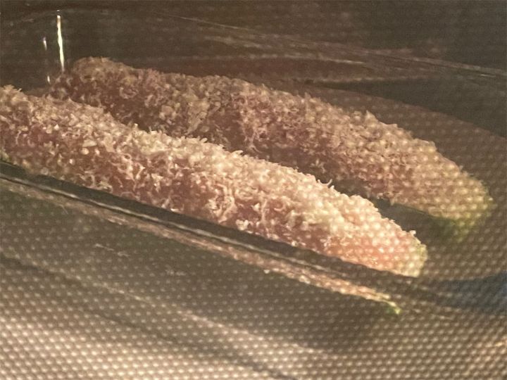 ピザ用チーズ、粉チーズでも代用可能。オーブンに入れる際は、吉田シェフはお皿にクッキングペーパーを引いて焼いていました。天板に直接クッキングペーパーでもいいのかも。今回は耐熱皿に並べて焼きました。