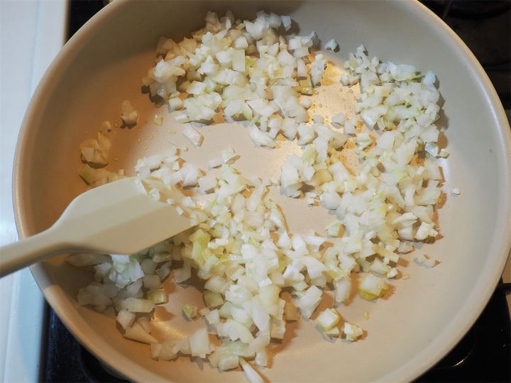炒めた5をそのまま豚ひき肉と併せてしまうと、豚ひき肉に火が入ってしまい脂も溶け出してしまうとのこと。