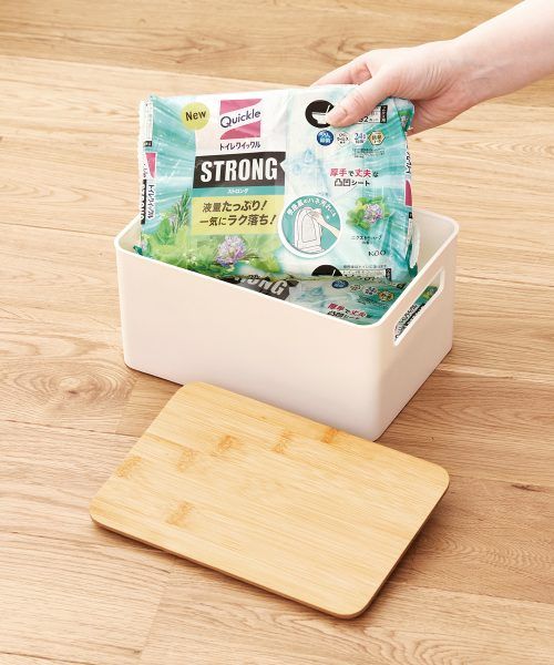 おそうじシートが2つ入る大きさのケース。ストックも一緒に収納できるので在庫の管理がしやすくなります。フタは竹素材で、シンプルなデザインがおしゃれです。