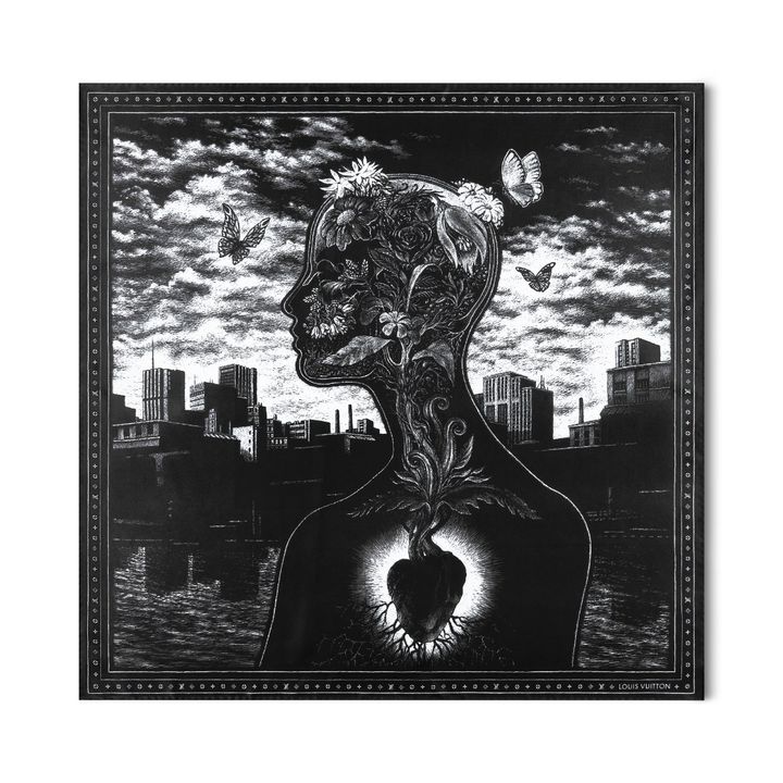 スイス人アーティストのトーマス・オットは、『The Number 73304-23-4153-6-96-8』といったダークで印象的なグラフィックノベルの中で、スクラッチボードを使用して完全な白黒の世界を作り上げ、純粋なビジュアルストーリーを展開。ルイ・ヴィトンのカレ「Urban Flowers」では、この緻密な作業を要するアーティスティックな技法を採用。繊細かつシュールな明暗法でイメージを描き、花を人間の抑えきれない精神のシンボルへと変容させ、都市に住む私たちの生活を一変させる自然の力を表現している。