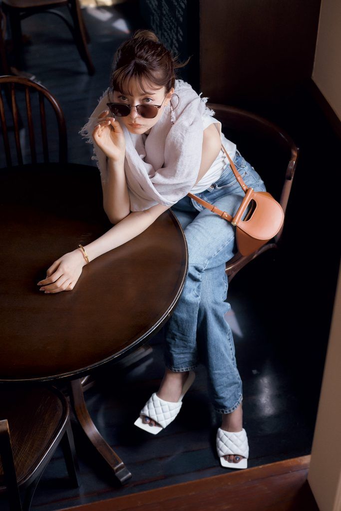 みんなの視線が集まること間違いなしのitサンダルで、デニムカジュアルも一気にアップデート。サンダル〈H3.5㎝〉¥143,000バッグ¥330,000(ともにボッテガ・ヴェネタ/ボッテガ・ヴェネタ ジャパン)Tシャツ¥8,580(スローン)パンツ¥46,200(ディーゼル/ディーゼル ジャパン)ストール¥28,600(アソース メレ/デミルクス ビームス新宿)サングラス¥42,900(アイヴァン/アイヴァン 東京ギャラリー)ピアス¥58,300(マリハ)バングル¥275,000(ウノアエレ/ウノアエレ ジャパン)
