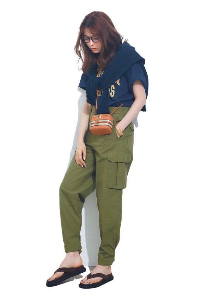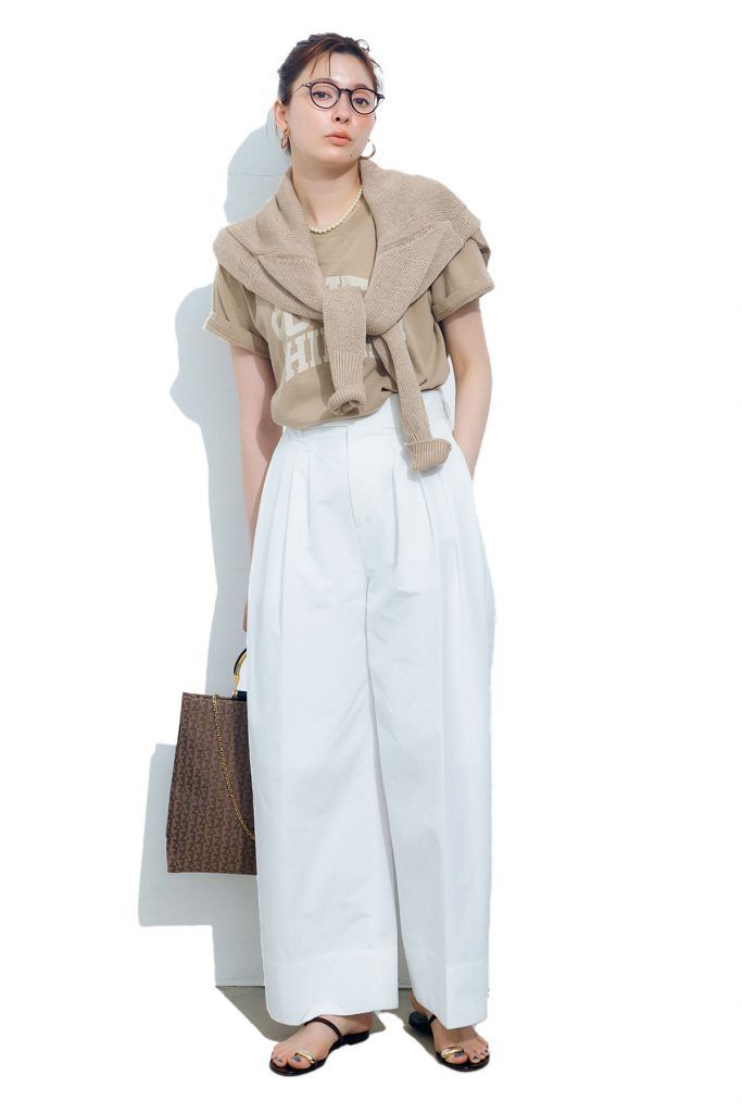 サンダル〈H1㎝〉¥35,200(イル サンダロ オブ カプリ/アマン)Tシャツ¥9,900(ウィム ガゼット/ウィム ガゼット ルミネ新宿店)肩に掛けたニット¥26,400(カオス/カオス 表参道)パンツ¥20,900(ステュディオス/ステュディオス カスタマーサポート)眼鏡¥41,800(アイヴァン/アイヴァン 東京ギャラリー)ネックレス¥8,400イヤリング¥8,640(ともにアビステ)バッグ¥143,000(ザンケッティ/八木通商)