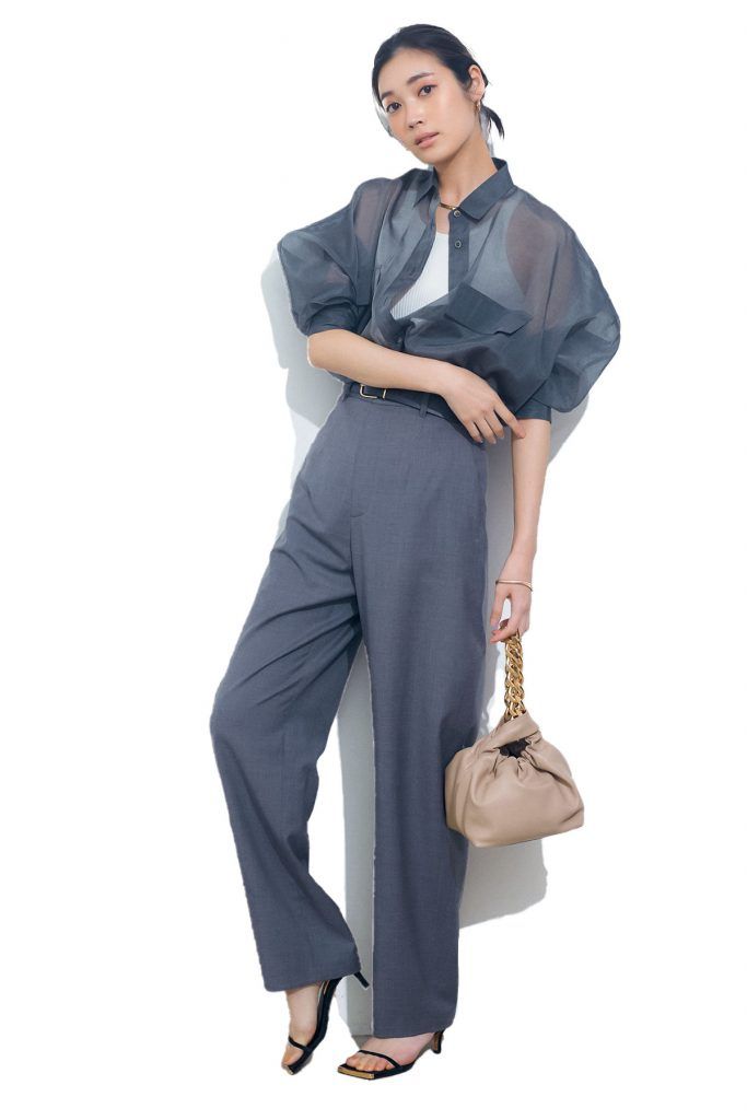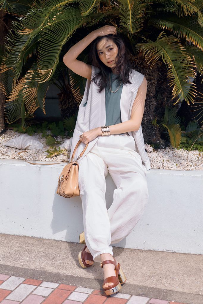 今季トレンドのゆるっとしたパンツセットアップを着る日は、大人っぽい小物使いでリッチな味付けをするのを忘れずに。フォルムがしっかりとしたプラットフォームサンダルが、リラックス感のあるエアリーなスタイルをピリリと引き締めてくれます。サンダル〈H10㎝〉¥140,800バッグ¥278,300 バングル¥107,800リング¥44,000(すべてクロエ/クロエ カスタマーリレーションズ)ジレ¥39,600ブラウス¥23,100パンツ¥36,300(すべてサクラ/インターリブ)ネックレス¥24,200(マリハ)
