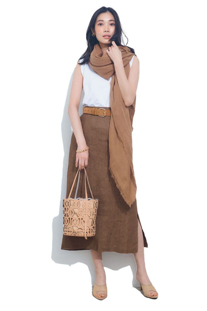 サンダル〈H7㎝〉¥29,700(ハァウ/ウィム ガゼット ルミネ新宿店)Tシャツ¥12,100(チノ/モールド)スカート¥28,600(RHC/RHC ロンハーマン)ストール¥29,700(スロー)ベルト¥20,900(アトリエ アンボワーズ/アマン)ピアス¥17,600ブレスレット¥23,100(ともにワンエーアールバイウノアエレ/ウノアエレ ジャパン)バッグ¥49,500(アニタビラルディ/アルアバイル)