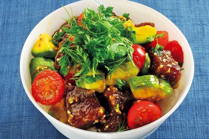 丼にご飯を盛って②をのせ、ハーブを飾る。
