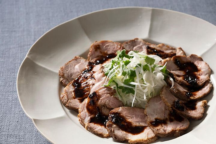 ②の豚肉は幅7~8mmの薄切りにして皿に並べる。袋に残った漬け汁はフライパンに入れて中火で煮詰め、肉にかける。