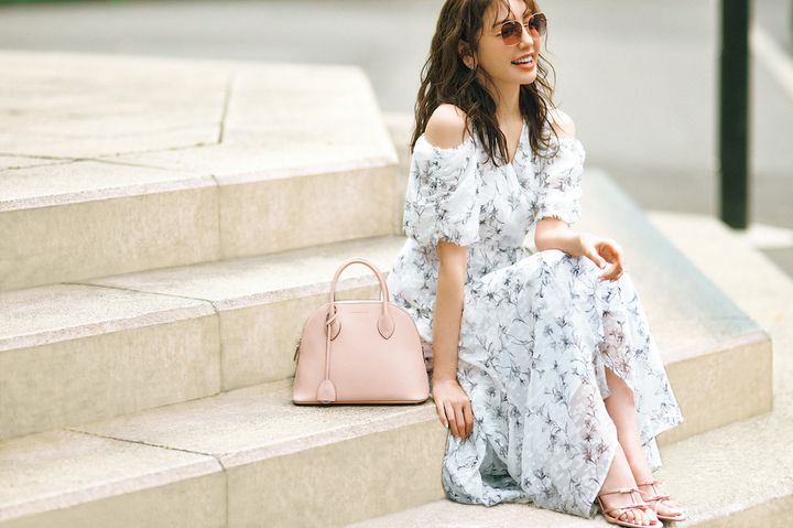 ワンピース¥26,400/マイストラーダ バッグ¥176,000/BONAVENTURA(BONAVENTURA カスタマーサポート) サングラス¥17,600/ランバン オン ブルー(デリーゴジャパン) ピアス¥7,020/アビステ シューズ¥5,990/ ZARA(ザラ カスタマーサービス)