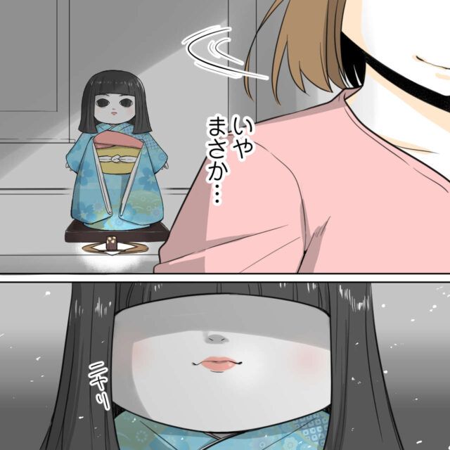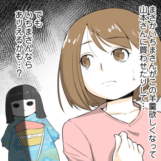 母方の家に代々引き継がれている市松人形の「いちまさん」。マキさんにとっては、子どもの頃からちょっぴり怖い存在でした。第二子ソウスケくんのお披露目会に来ていた山本さんは価値のありそうないちまさんに目を付けて、売ってしまおうと盗んで帰りましたが、その日から毎晩いちまさんの怖い夢を見るようになったことに怯え、菓子折りを持って謝罪と返却にきました。無事いちまさんも返ってきてこの件は一件落着。家に帰って来たいちまさんを見て娘のユカちゃんは大喜びでした。ユカちゃんは「(山本)キラくん家にいたんでしょ」とユカちゃんが知るはずもないことを言ってきてマキさんは驚きます。理由を聞くと盗んだことを知らない山本さんの息子キラくんもいちまさんが「帰りたい」と言う怖い夢をみたそう。その件もあって山本さんは急いで謝罪をしに来たのだとマキさんは納得しました。