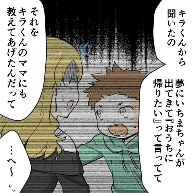 「キラくんから聞いたの。夢にいちまちゃんがでてきて(おうちに帰りたい)って言っててそれをキラくんのママにも教えてあげたんだって。」とユカはキラくんに聞いた話を教えてくれました。