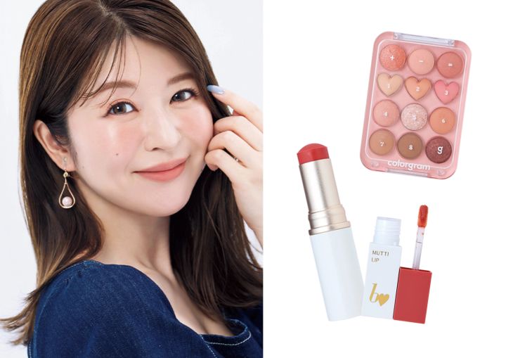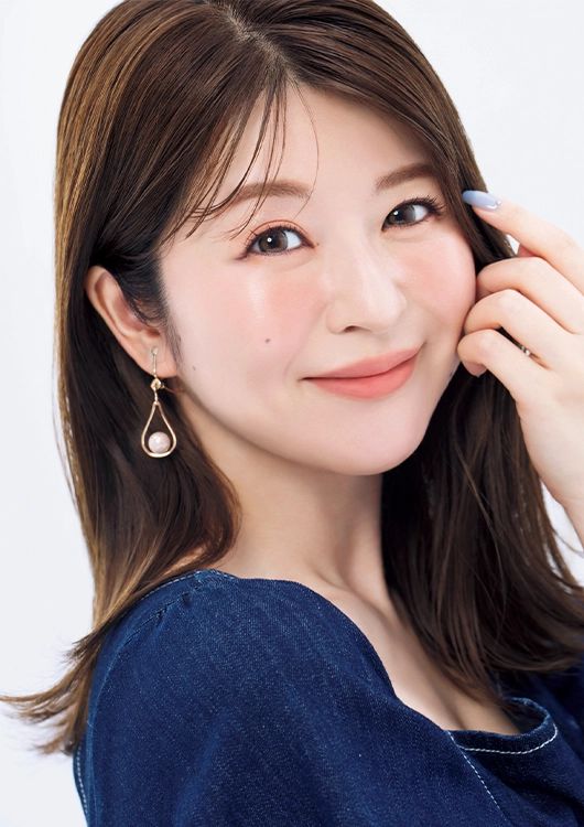 和顔さんはモテメイクはみずみずしいツヤ感がポイント。アイメイクはまぶたの中央に繊細なパールをのせて、キラッと上品に輝かせて。頬はバームを逆三角形に入れて内側からじゅわっとしたツヤと血色を。パーツ全部がツヤツヤだと品がなくなるので、唇はマットリップでバランスを調節。