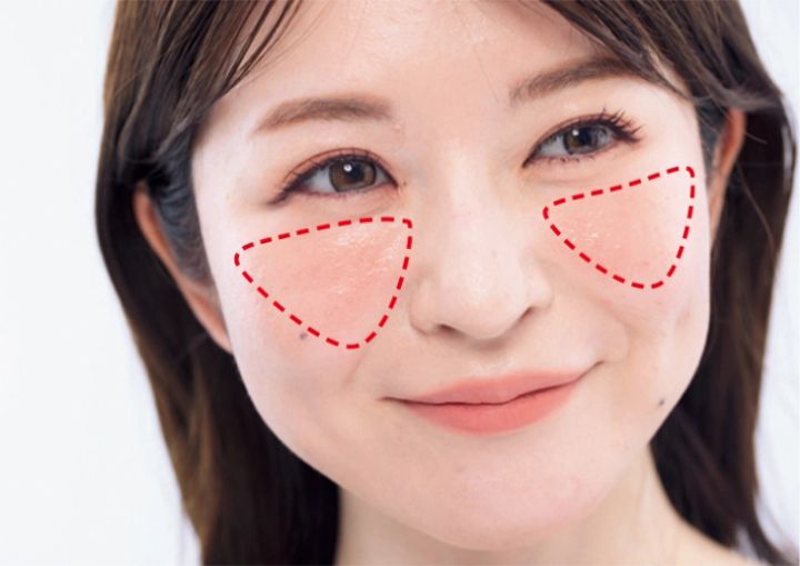 ピーチカラーのCを目の下に逆三角形になじませます。自然な光沢感が出るので、多幸感がUPします♡顔の余白も減るので小顔効果も◎。