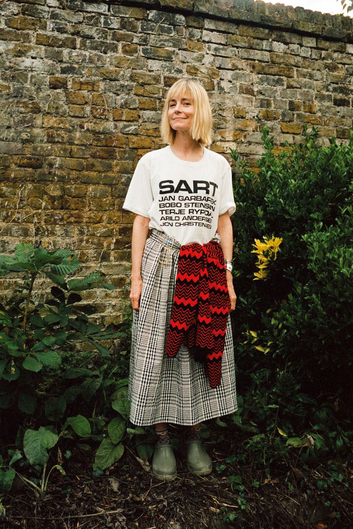 Tシャツを単独で着ることは普段ないというジェニファーだが、シモーネ・ロシャのカーディガンをウエストに加えることで自分らしく感じられるスタイリングに。