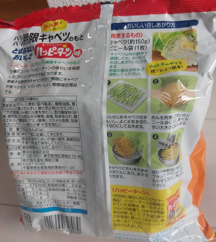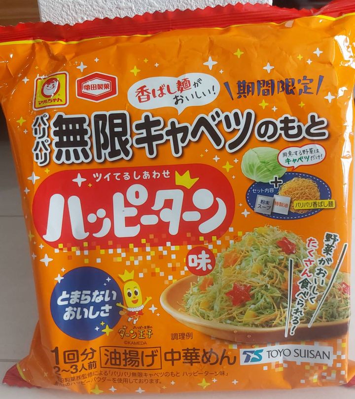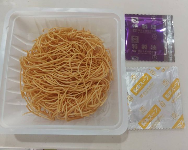 この商品は中に揚げ麺と粉末スープ、特製油が入っています