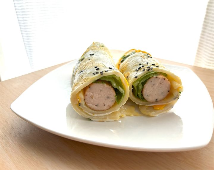 【韓国発の朝ごはん】「チキンラップ」を作ろう!卵の生地にソーセージや野菜をクルクル♪片手でパクリ♪