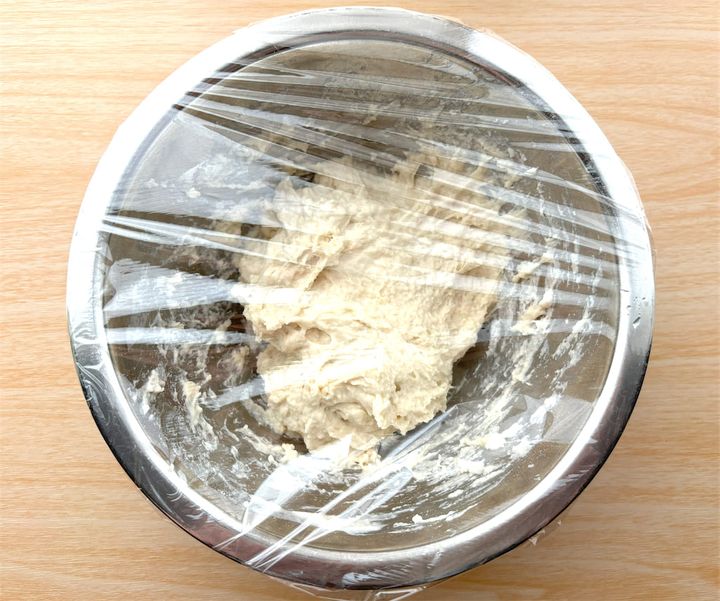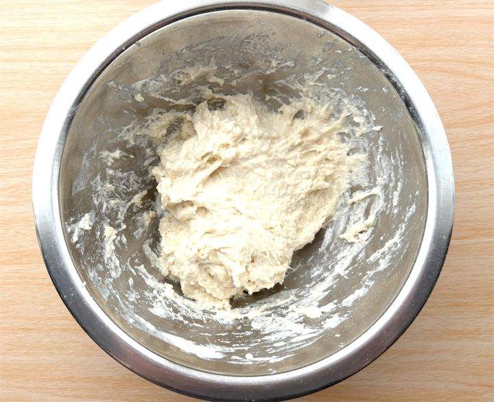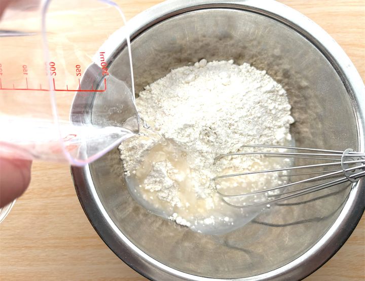 ボウルに中力粉を入れて、塩と水120mlを加えてからしっかり混ぜます。