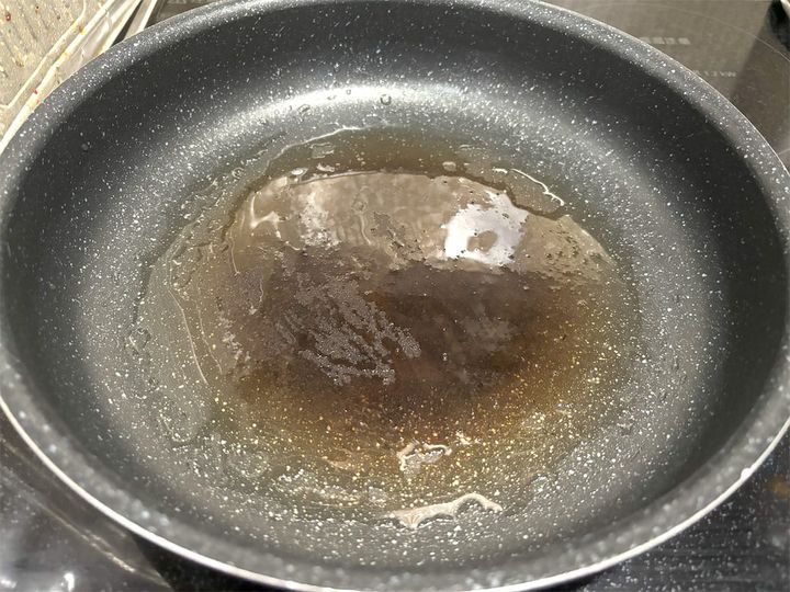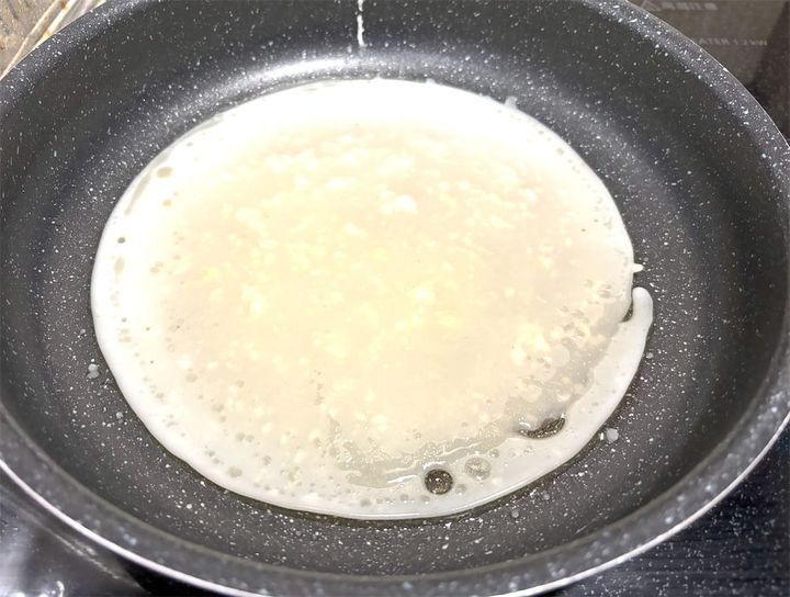 フライパンに油(分量外・適量)を塗り広げ、火を中火から弱火(IHクッキングヒーターだと160℃前後)で付けます。