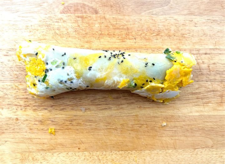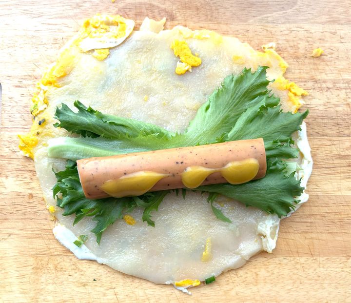 3. 【韓国発の朝ごはん】「チキンラップ」を作ろう!卵の生地にソーセージや野菜をクルクル♪片手でパクリ♪