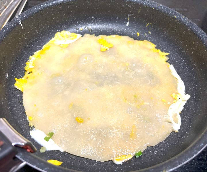 生地を裏返しにして火を止め、余熱で生地の卵面を焼いていきます。