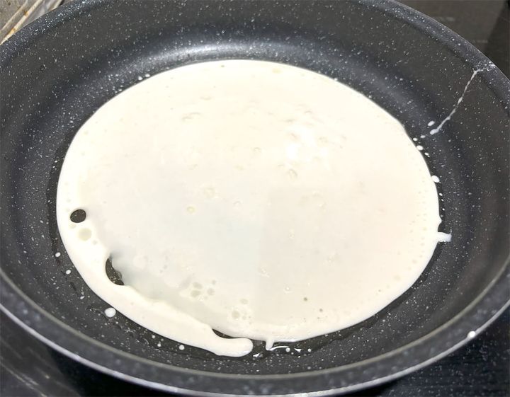 フライパンが温まったら1の生地をお玉1杯分流し入れ、フライパンを回して生地を全体に広げます。