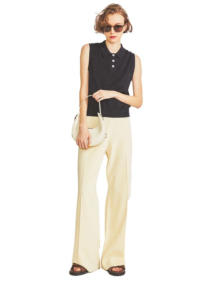 ネイビーノースリーブトップス 31,900円/デミリー(LITTLE LE AGUE Inc.) ニットパンツ 28,600円/ザ シンゾーン(Shinzone ルミネ新宿店) サングラス 25,850円/レイバン(ルックスオティカジャパン カスタマーサービス) バッグ 42,900円/オソイ サンダル 26,950円/カミナンド(グラビテート)
