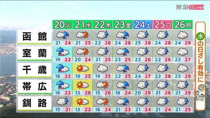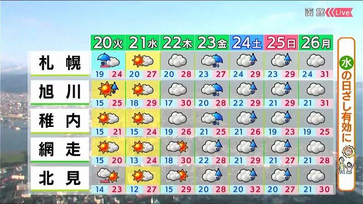 水曜はカラッと晴れますが、木曜の午後は早くも道南から雨が降り出し、金曜日にかけて雨脚の強まるおそれがあります。週末は蒸し暑さがぶり返します。