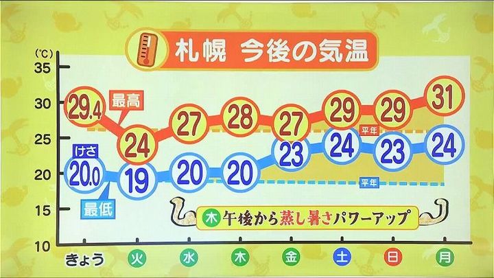 札幌の今後の予想気温を見ると、21日(水)からは再び25度以上の夏日。22日(木)の午後からは蒸し暑さがパワーアップして、週末は蒸し暑く、そして朝晩も24度くらいと寝苦しさが戻ってきそうです。