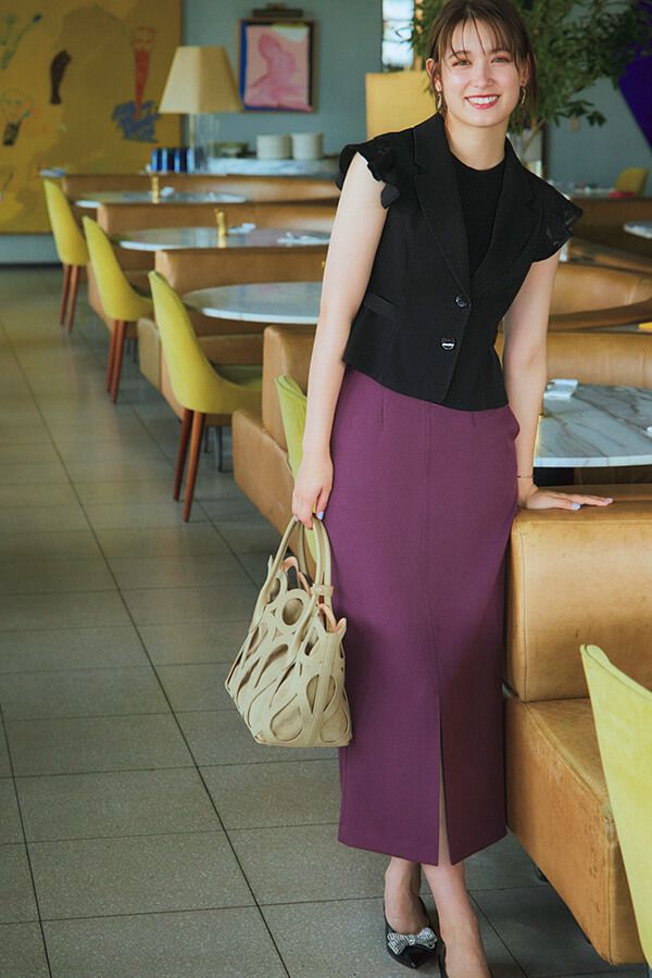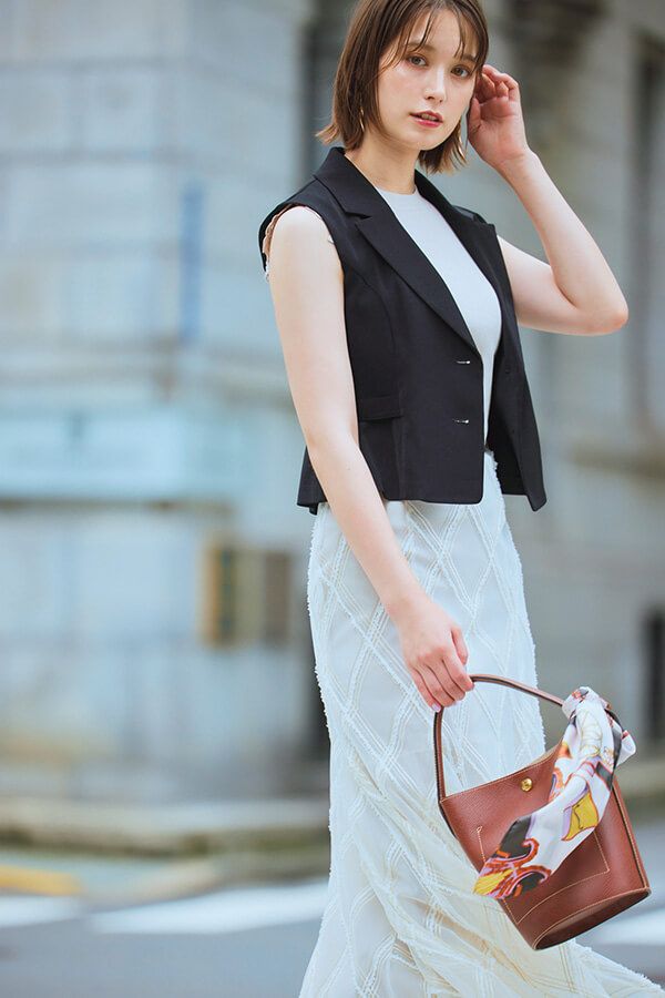 端正な黒ジレで淡色コーデを引き締めて。クロップトジレをポイントに持ってくることで、 マーメイドスカートのラインをより美しく。