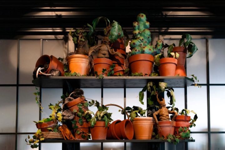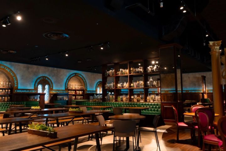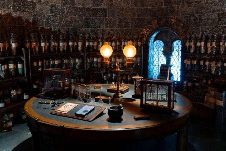 何百もの魔法薬の瓶が並ぶ棚も映画の世界そのもの!テーブルにある小道具演出も見逃せません。