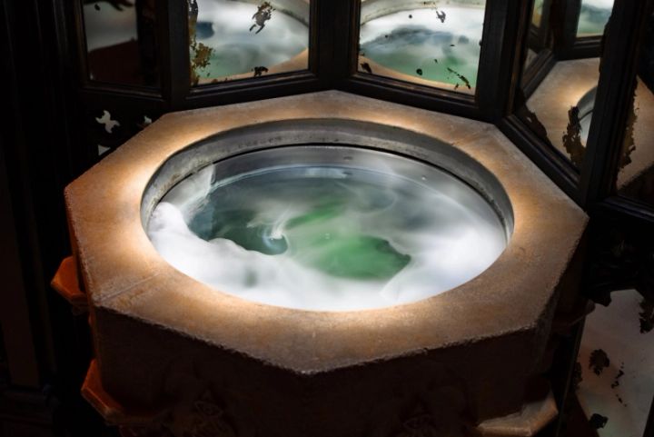 校長室にある憂いの篩(ふるい)は記憶を再現するシーンで、映画の中でも繰り返し登場しますよね。覗き込むとそこに映し出されるのは…