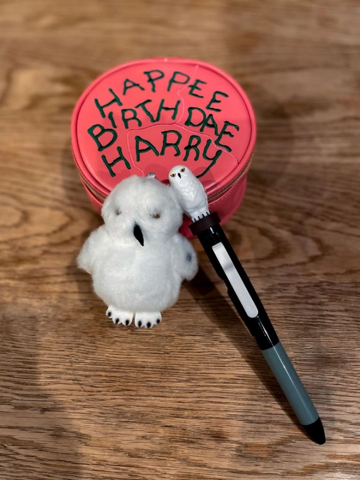 娘がヘドウィグ好きということで、キーホルダーをゲット。ボールペンはお会計するときに目が合ってしまって購入。取材時はちょうどハリーのお誕生日を祝うアイテムが限定でショップに登場していたので、「ハリーのバースデーケーキ」をモチーフにしたポーチもお土産に。おませな小学生女子のお眼鏡にかなったようで愛用してくれています♡