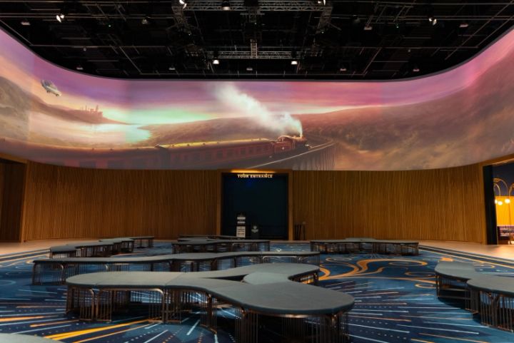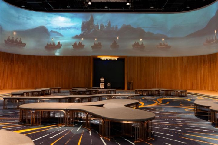 エントランスロビーでは、ツアーが始まる前にローブを着用し、あの「杖」を取り出して、誰もが楽しそうに魔法界へ行く身支度を始めていたのが印象的でした。上部のスクリーンには映画のワンシーンが映し出され、すっかり魔法ワールドへの入口に立った気分に♪