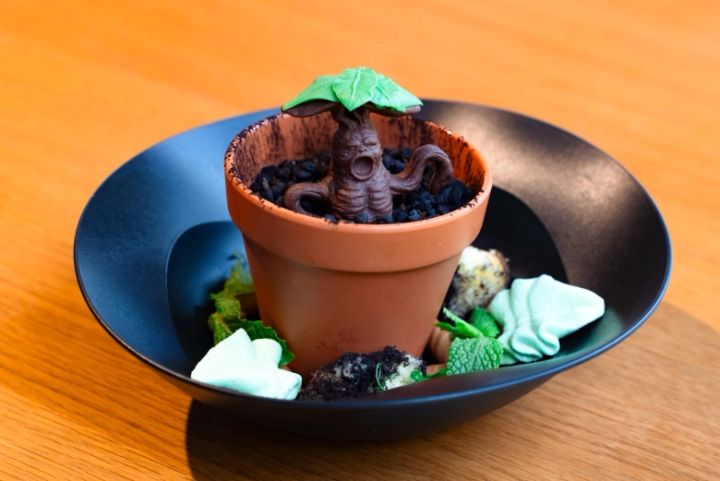 もうひとつ注目のデザートは、映画のシーンでもインパクトのあるマンドレイクをトッピングしたチョコレートトライフル。植木鉢風の容器に入ったチョコレートのトライフルをミントの葉でデコレーション。中央のマンドレイクの表情が何とも言えませんね。